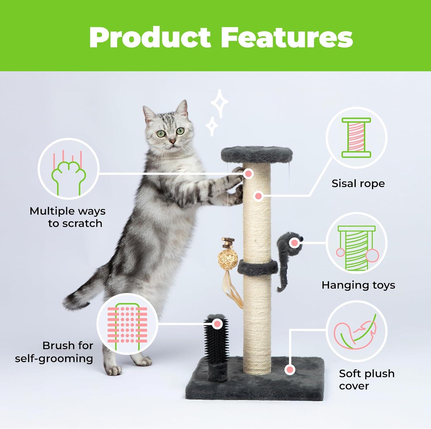 Engage and Satisfy with a Simple Tool: This scratching post for indoor cats adults blends seamlessly with toys to captivate your pet's attention for hours. It is also equipped with a brush to enable your cats to gently groom themselves. Engage your pet without complex toys or extensive interventions, addressing their needs and ensuring their happiness with a simple, effective means to improve their living environment